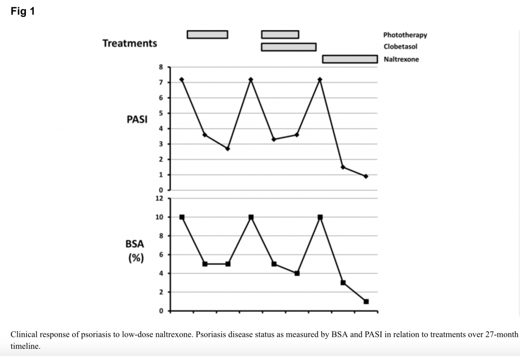 Given that traditional psoriasis treatments may not always be successful, affordable, or tolerable, this study shows that clinically LDN may have implications for patients who cannot tolerate other therapies or for whom other treatments have not been successful. The study authors note, “Although it is typically not possible to establish cause and effect with a single case, this is an interesting and novel finding that warrants further study. Treatment of psoriasis with low-dose naltrexone may be appealing because of its low side-effect profile, low cost, and its efficacy in patients with chronic inflammatory conditions.”