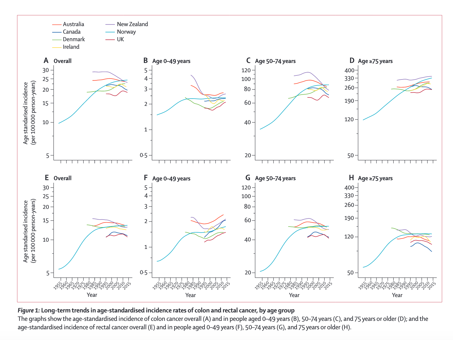 Source: M Araghi et al. Colorectal cancer incidence on the rise among young adults in several high-income countries. Lancet Gastroenterol Hepatol 2019, Published online May 16, 2019 http://dx.doi.org/10.101/S2468-1253(19)30147-5