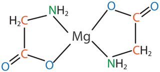 One form of magnesium that has gained significant research attention is magnesium amino acid chelate – specifically magnesium bisglycinate chelate. The term chelate means that a ligand or binding substance grabs a mineral to form a heterocyclic ring structure. In the case of magnesium bisglycinate chelate, the ligand is the amino acid glycine. There are two glycine molecules for each magnesium atom, and it forms a heterocyclic ring as shown in the figure below: