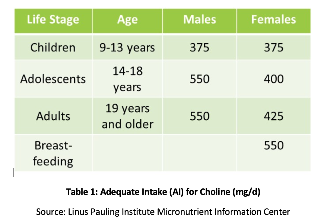 Phosphatidyl choline (PC) is essential to the health of all the cells in the body and is one of the main phospholipids of which cellular membranes are comprised.[4],[5] PC comprises over 90% of the total bile phospholipids content and facilitates fat emulsification, absorption, and transport.[6] Studies have shown that the recommended adequate intake (AI) of choline (see Table 1) may not be sufficient for prevention of symptoms of deficiency such as fatty liver changes or muscle damage.[7] Additionally, a recent study found that only 8% of US adults meet the recommended AI of choline, with vegetarians, postmenopausal women, and men at greatest risk of inadequacy.[8],[9] Genetic polymorphisms also may increase the need for choline,[10] which also is a source of methyl groups in the body.