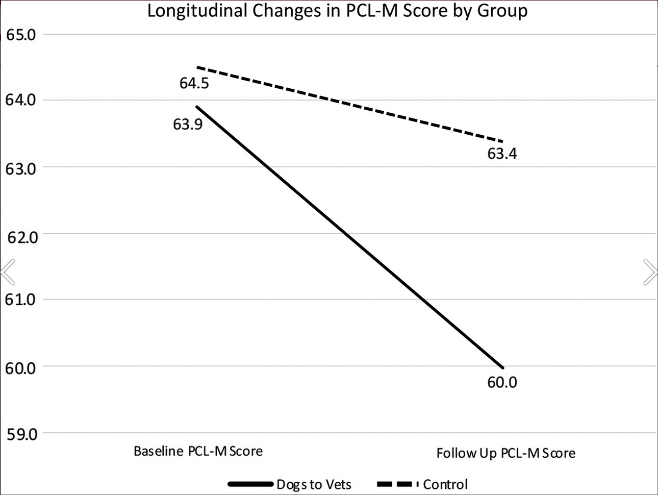 Among Dogs2Vets participants there was a significant decline (p = 0.03) in PCL-M scores with a mean decline of 4.2 (SD 8.5) points. However, there were no significant changes at follow-up among the control group; in fact, there was even a moderate increase of 0.5 (SD 8.1) points.