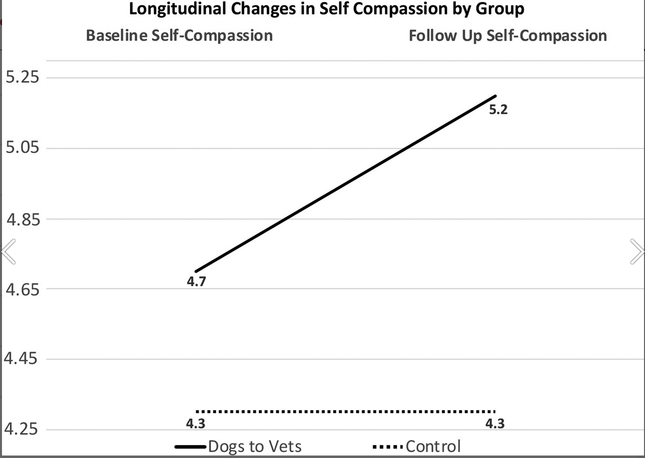 Participation in the Dogs2Vets program significantly predicted improvements in self-compassion at 12 months (p ≤ 0.001). However, there were no significant changes in the regression model for the control group.