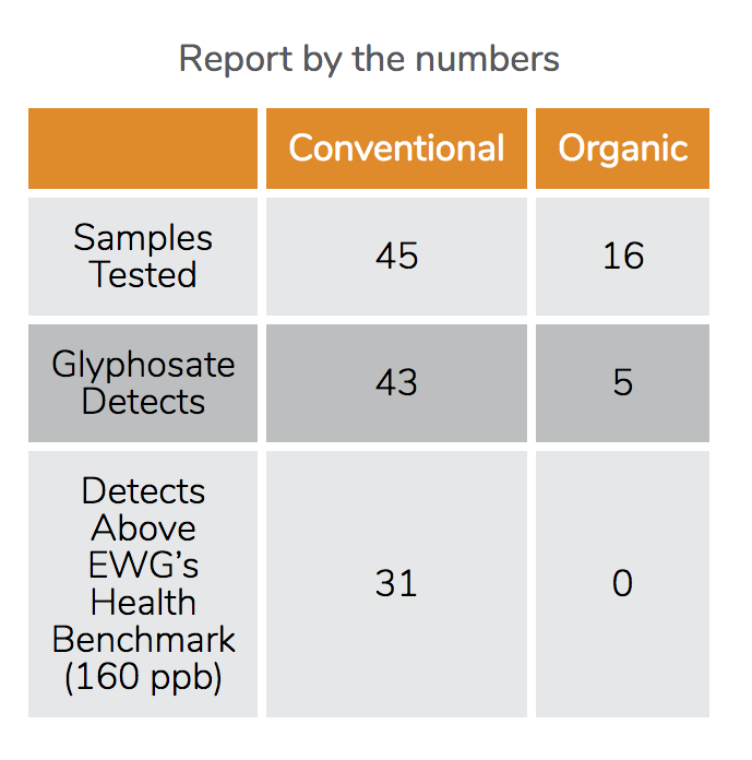 after harvest to dry out the grains for a higher market value. The EWG found glyphosates in but two of 45 samples of products made with conventionally grown oats. Almost three-fourths of those samples had glyphosate levels higher than what EWG scientists consider protective of children’s health with an adequate margin of safety see the image). About one-third of 16 samples made with organically grown oats also had glyphosate, all at levels well below EWG’s health benchmark.
