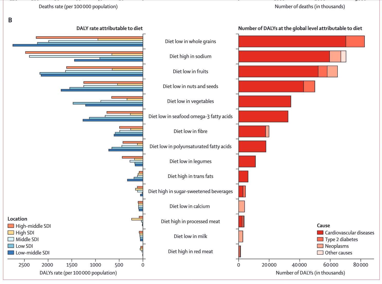 disease being the biggest contributor, followed by cancers and type 2 diabetes. - Largest shortfalls in global consumption were seen for foods such as nuts and seeds, milk, and whole grains, while sugary drinks, processed meat and sodium were overeaten.