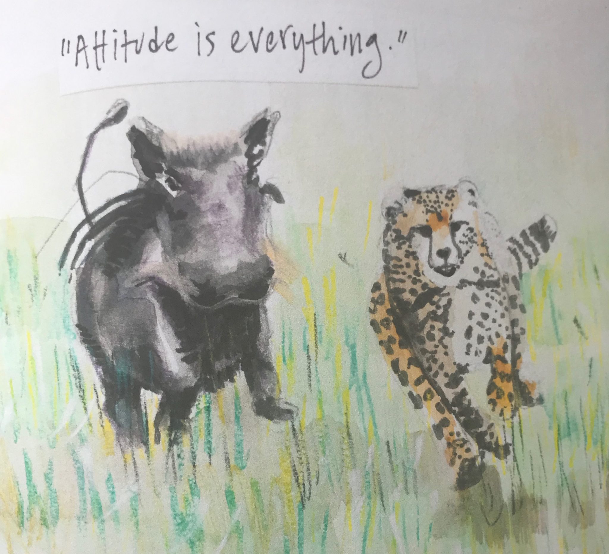 TP: Your recently released book, Wild Wisdom, A Warthog’s Tale, is full of wonderful tidbits of wisdom from the warthog: “Compliant or engaged? Who Am I? … Only I can be responsible for my own life”; “Nobody told me about cancer’s collateral damage;” “Surviving isn’t enough, My goal is to thrive.” At the heart of the book is post traumatic stress disorder (PTSD), mental health and being very self aware of your thoughts and responses to everything that has happened. It’s hard to imagine how anyone could pull one’s self up from so many traumatic events. What did you and your doctors do to help you work through the grief, as well as the physical and mental pain?