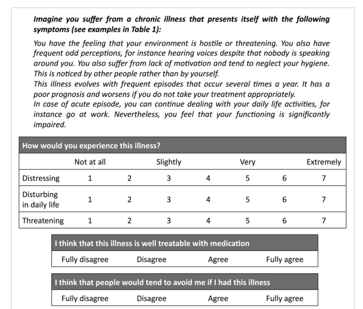 From here, participants complete questions to assess their belief in the effectiveness of each of the treatment options. Then, for each illness, participants were invited to rate on a 4-point scale (1 = fully disagree, 2 = rather disagree, 3 = rather agree, 4 = fully agree) the following statement: “I consider the following treatment option as efficient for schizophrenia (or RD, MS, RA)” followed by each treatment option. This provided researchers with a “score of belief in treatment effectiveness.”