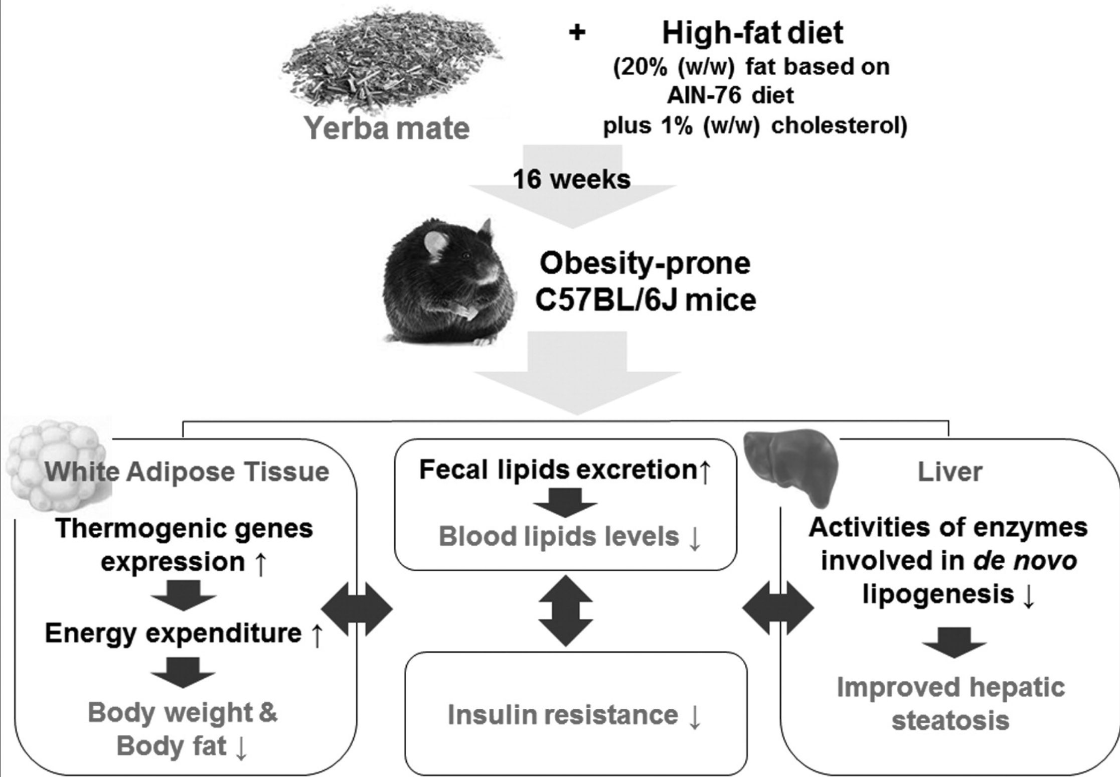 These findings support previous reports regarding the anti-obesity effect of yerba mate and suggest that yerba mate may represent a useful natural candidate for the control of obesity and obesity-related insulin resistance, dyslipidemia, and hepatic steatosis. However, further studies are needed to determine maximum tolerated dose of oral yerba mate powder.