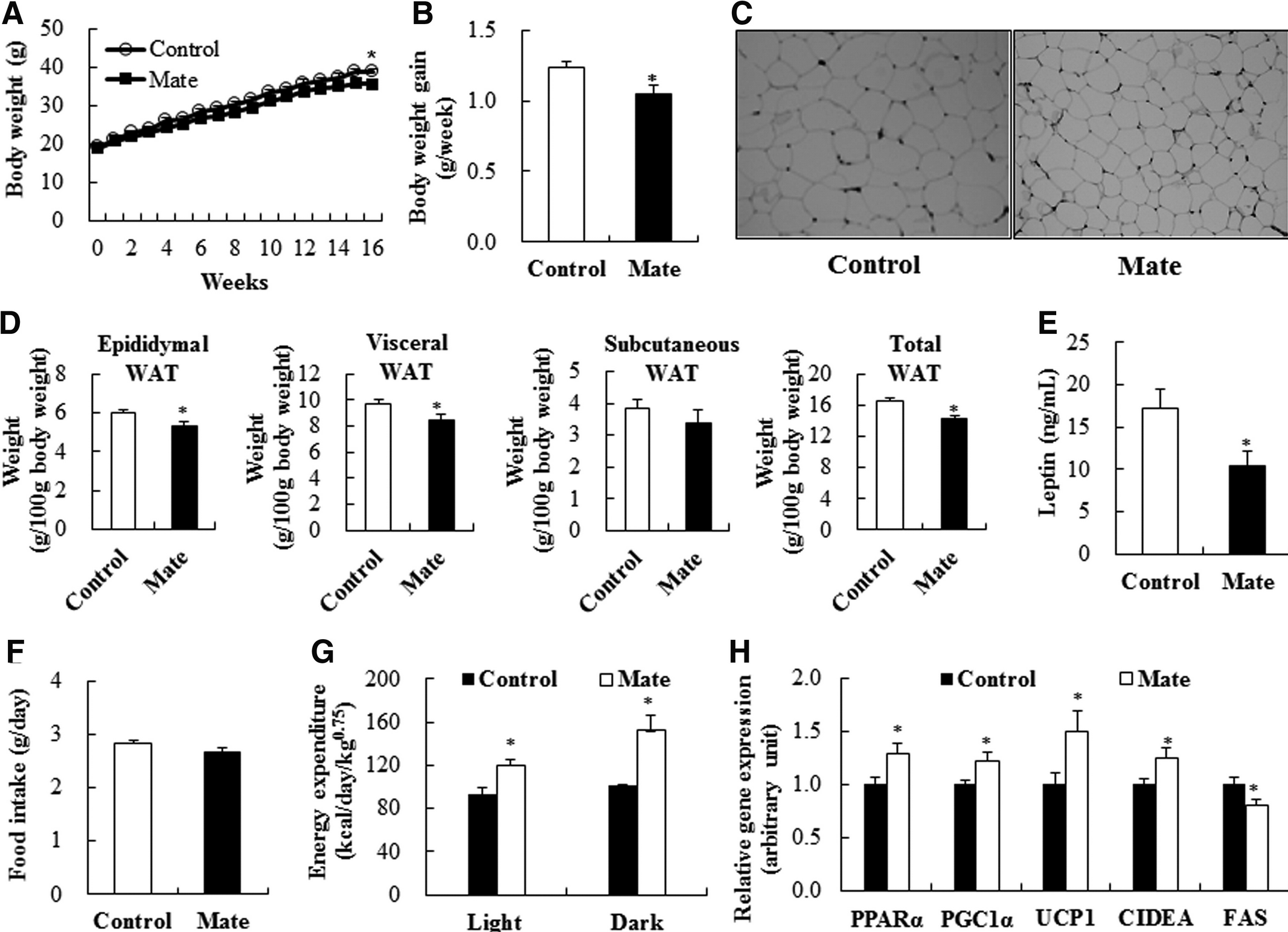 Conclusion: The results support previous findings showing that yerba mate protects against body weight gain and adiposity. This study first demonstrated that long-term supplementation of dietary yerba mate increased energy expenditure and upregulated mRNA expression of thermogenic genes in WAT, whereas it downregulated mRNA expression of fatty acid synthase (FAS) in WAT, which may result in reduced adiposity in HFD-induced obese mice.